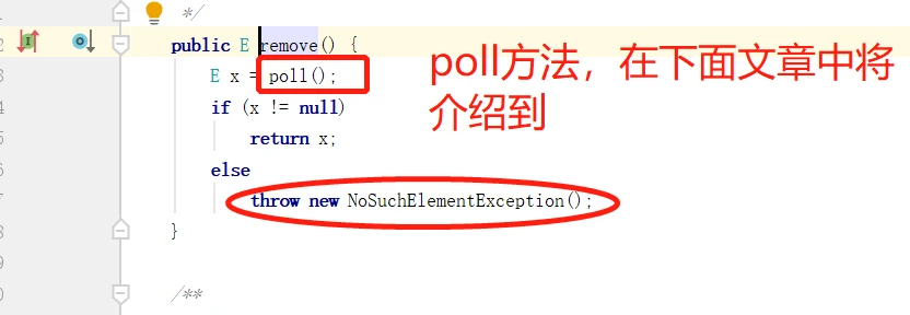 源码中调用了poll方法,当获取到的对象不为空的时候,返回获取到的对象;如果为空的话,就抛出:throw new NoSuchElementException();异常。