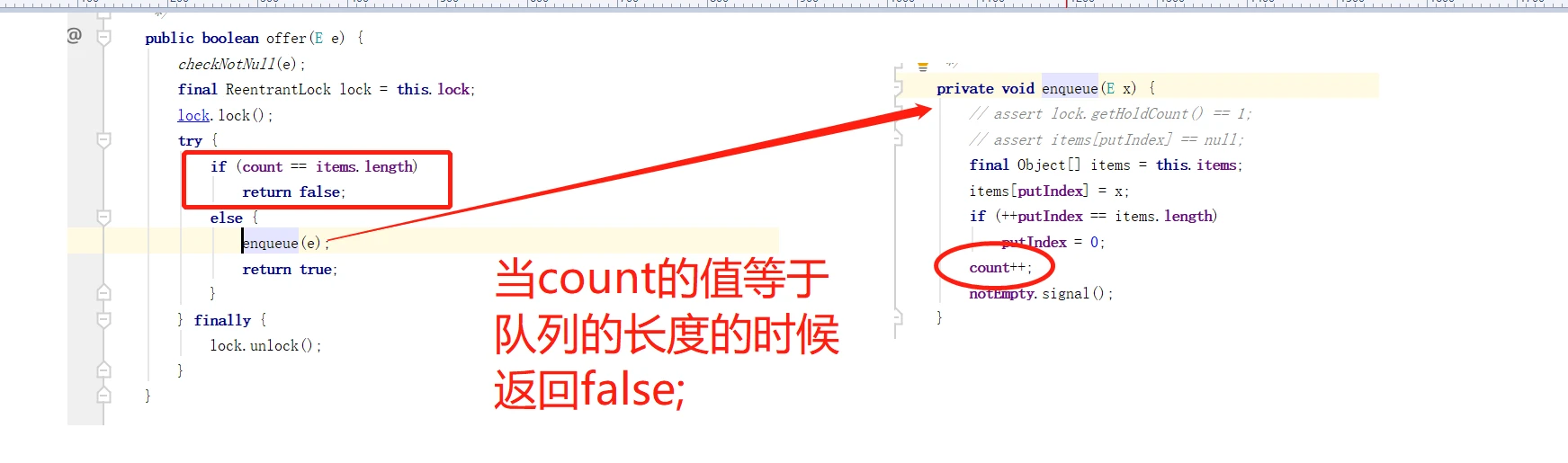 如果不等于,调用enqueue方法,然后count++,返回true.