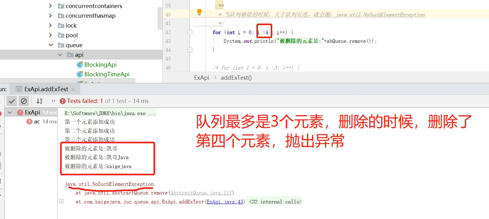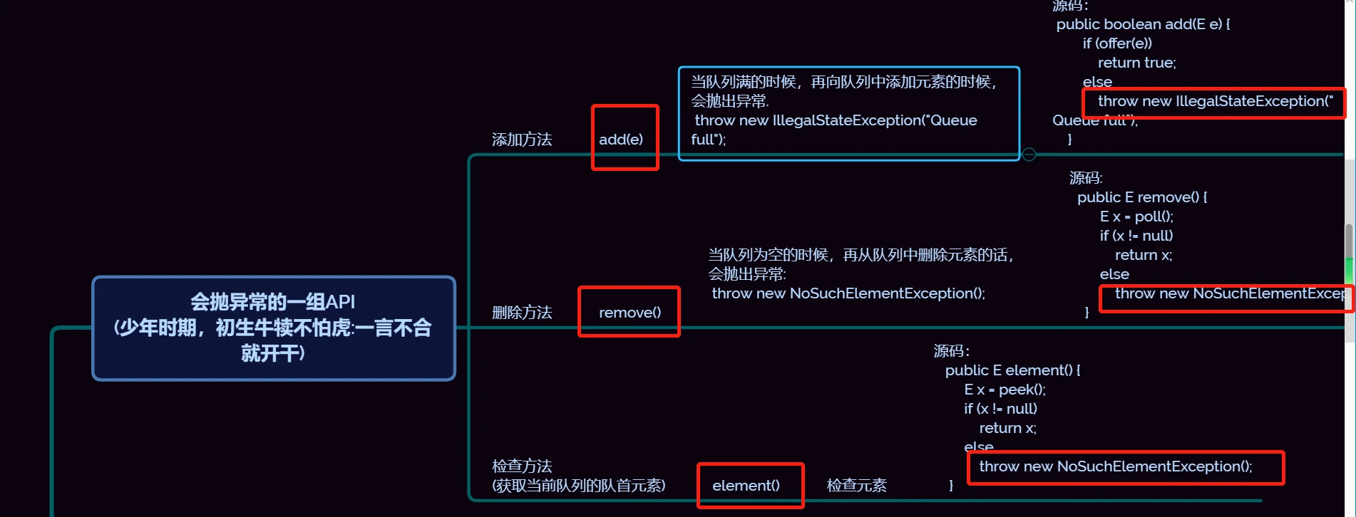 第一组API三个方法我们都讲解完了。Add/remove/element方法。最大的特点就是,队列为空或者是队列满了,继续操作队列的话,就会抛出异常。这个凯哥根据就像我们人的一生中少年时期一样,初生牛犊不怕虎,遇到什么不服的或者是不顺心的就暴躁了,碰不得,一碰就爆炸。一言不合就开干!