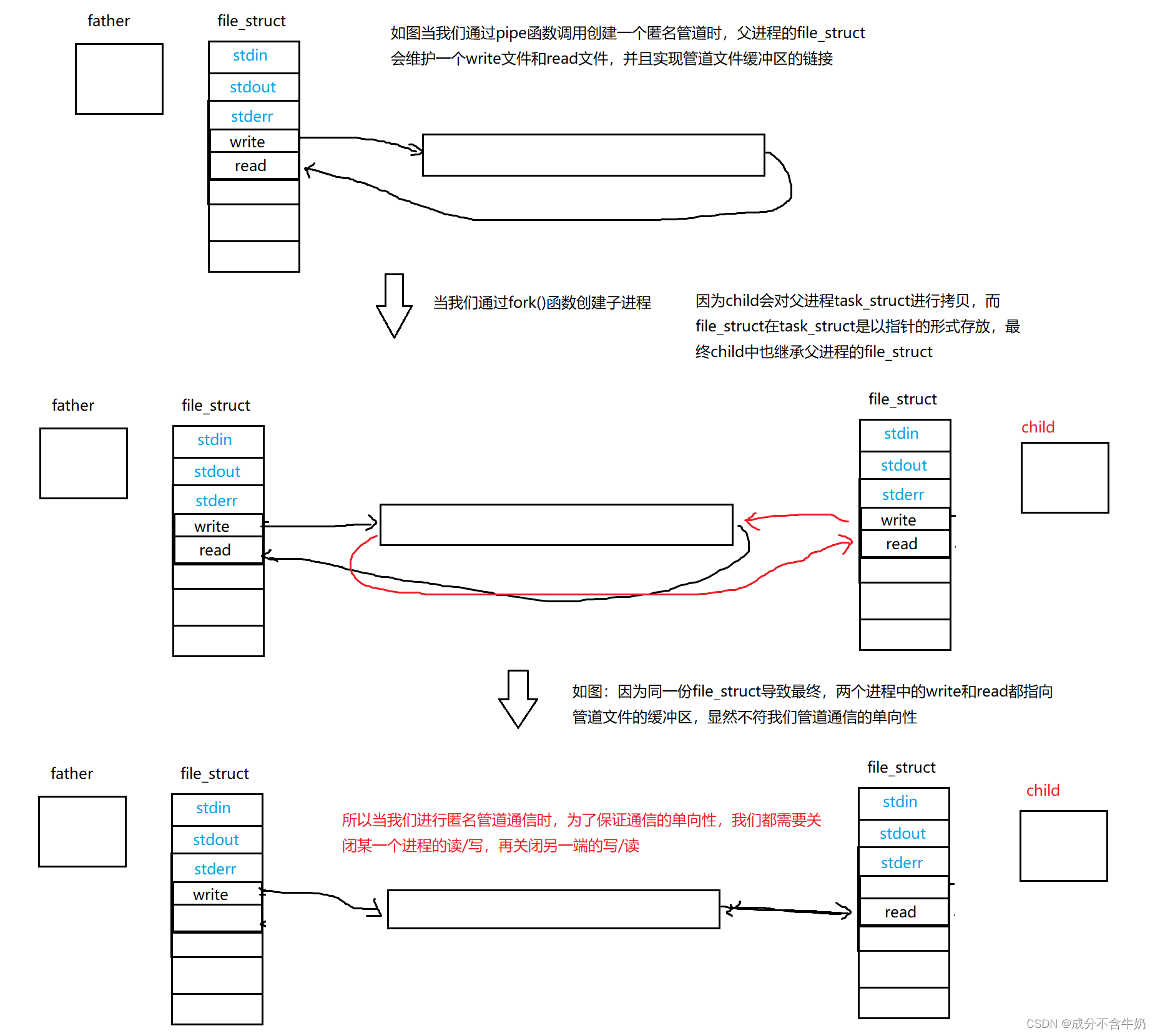 如图这就是:匿名管道通信的原理,通过管道函数,在进程中开辟两个文件来实现读写功能,再通过进程的拷贝,实现对同一个文件的读写,最终各自释放一个读/写端,实现单向通信。