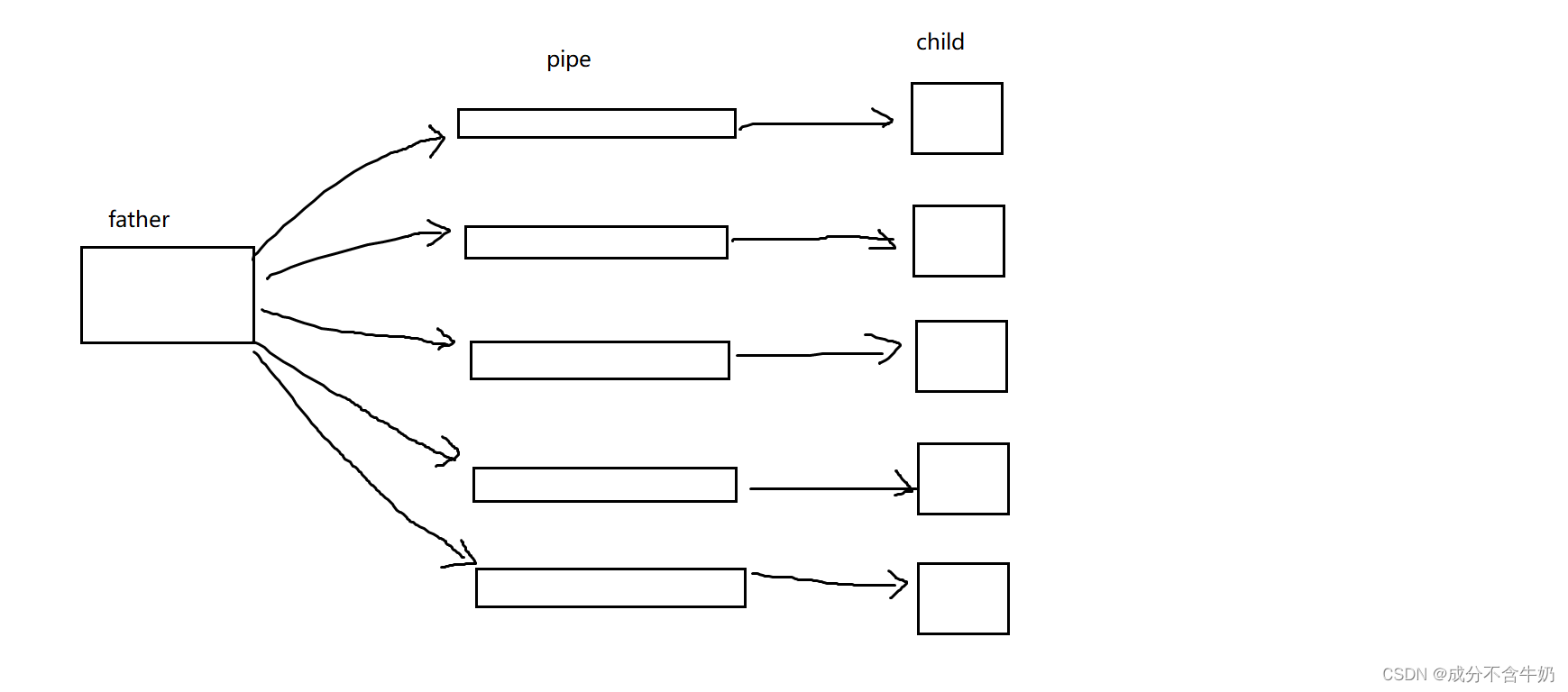 如图我们通过父进程,创建五个子进程,在子进程创建的同时我们创建管道文件,进行父进程和子进程通过匿名管道的通信