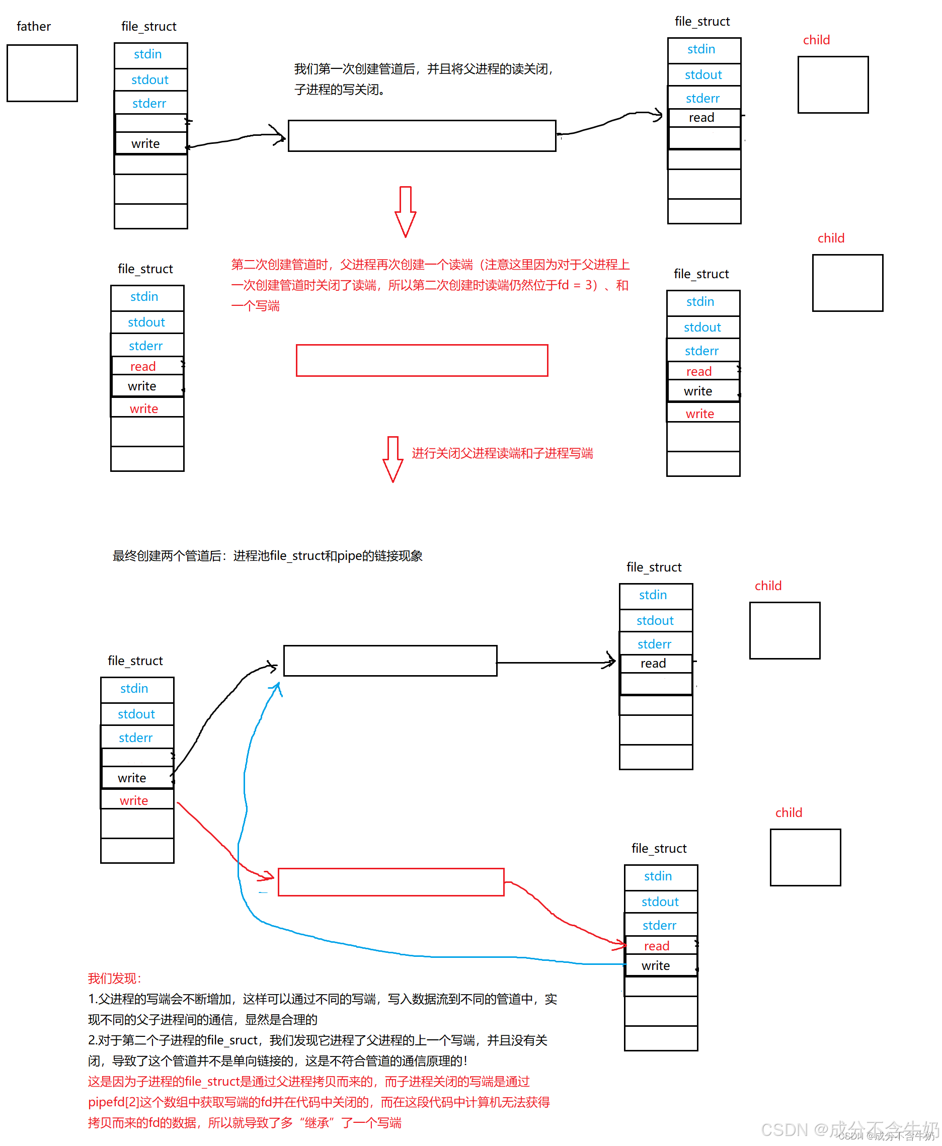按照这个思路:最终我们发现在创造了5个子进程之后,最后一个子进程对应的file_struct会继承4个父进程的写端!!!这个bug虽然不影响我们的通信,但是会影响我们后续对写端的回收,终止这个进程池,这在我们后面的代码模块有具体讲解!!!