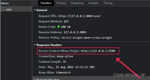 当客户端访问时服务端接口时,就可以看到响应头中服务端配置的Access-Control-Allow-Origin: