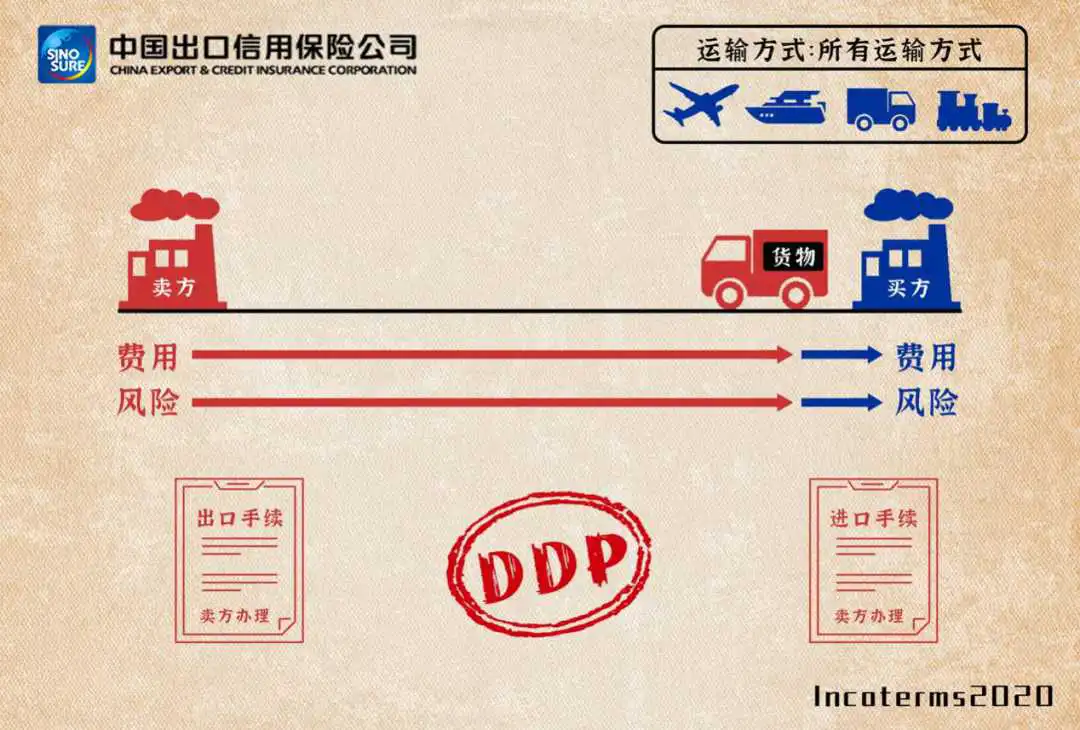 DDP的全称是Delivered Duty Paid (…named place of destination)即完税后交货(...指定目的地) ,卖方在指定的目的地办完清关手续将在交货的运输工具上尚未卸下的货物交给买方处置,即完成交货。卖方承担将货物运至目的地的一切风险和费用,包括在需要办理海关手续时在目的地应缴纳的任何进口税费。