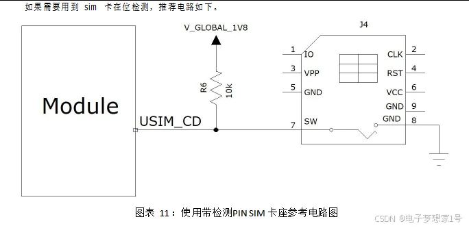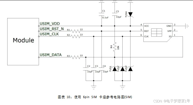 下图是 SIM 接口的参考电路,使用 6pin 的 SIM 卡座。