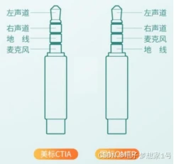 耳机根据第 3 段和第 4 段的接线定义不同可以分为 国标OMTP 和 美标CTIA 两种,在设计耳机插座的电路后需要选择相应的耳机。