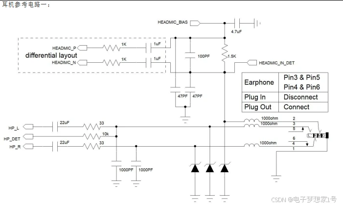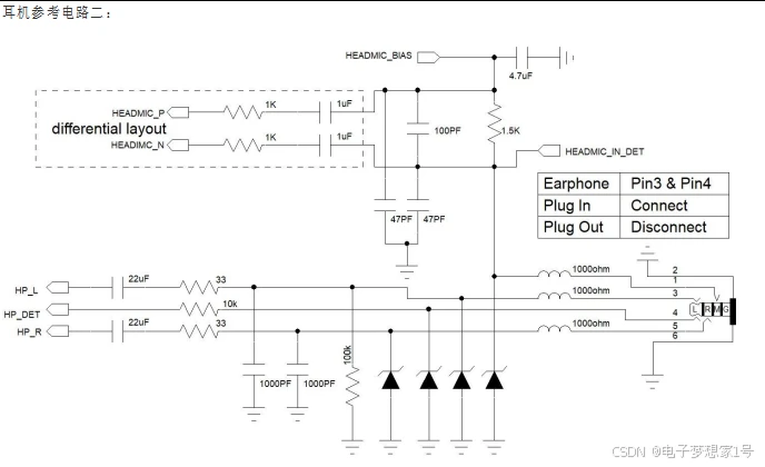 这个耳机电路存在一个弊端,由于耳机拔出后需要给 22uF 电容充电后HP_DET 才能为高,导致耳机拔出检测会延迟 6-10 秒左右的时间,故推荐将耳机电路修改成下面的参考电路二