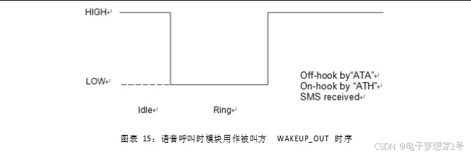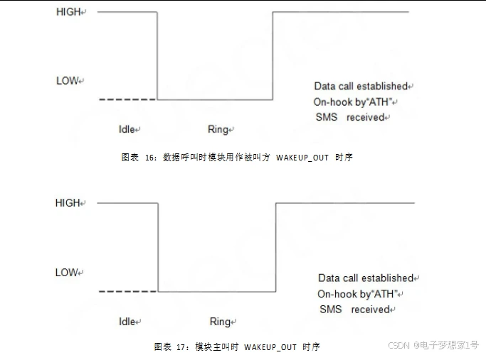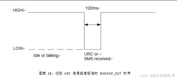 如果模块用作主叫方,WAKEUP_OUT 会保持高电平,收到 URC 信息或者短信时除外。而模块用作被叫方时,