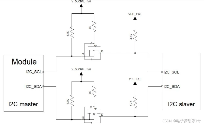 V_GLOBAL_1V8 是模块 I2C 的参考电压。VDD_EXT 是 I2C 设备的参考电压。电平转换用的 NMOS 管必须选用结电容小于 50pF 的型号,推荐型号如下:
