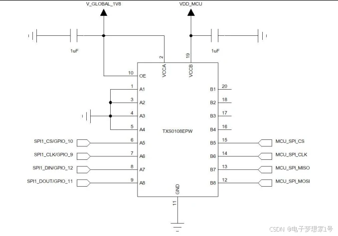 Air724UG 的SPI 接口电压是 1.8V,如果需要外接 3.3V/5V 的外设,需要加电平转换芯片,推荐采用TI