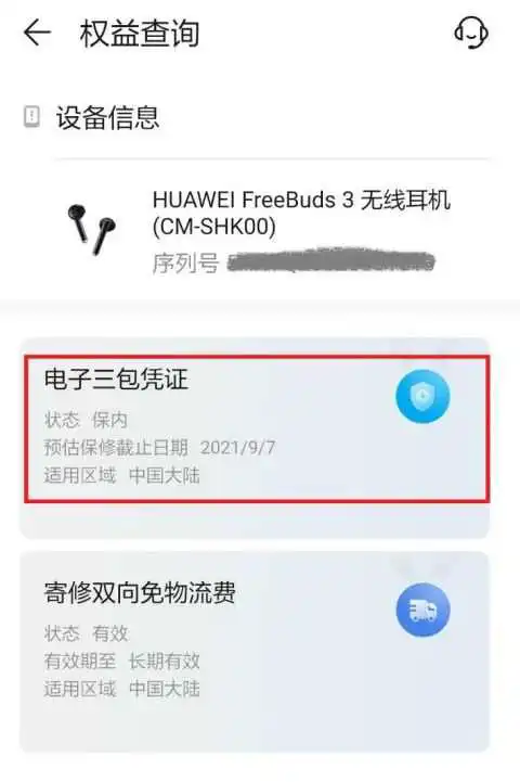 4、进入权益查询页面,在【电子三包凭证】显示华为蓝牙耳机的保修期日期,