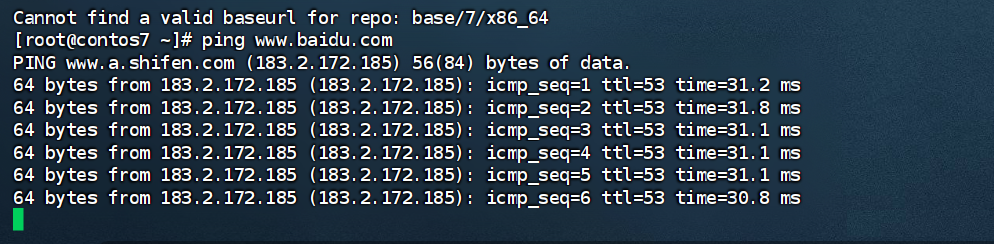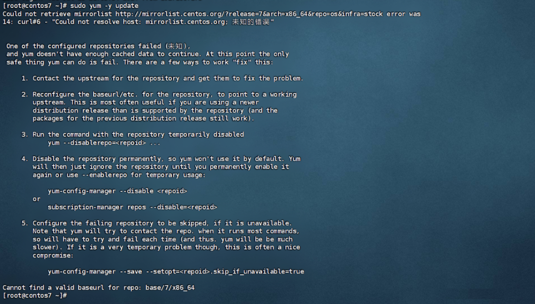 [root@contos7 ~]# sudo yum -y updateCould not retrieve mirrorlist http://mirrorlist.centos.org/?release=7&arch=x86_64&repo=os&infra=stock error was14: curl#6 - "Could not resolve host: mirrorlist.centos.org; 未知的错误" One of the configured repositories failed (未知),and yum doesn't have enough cached data to continue. At this point the only safe thing yum can do is fail. There are a few ways to work "fix" this: 1. Contact the upstream for the repository and get them to fix the problem. 2. Reconfigure the baseurl/etc. for the repository, to point to a working upstream. This is most often useful if you are using a newer distribution release than is supported by the repository (and the packages for the previous distribution release still work). 3. Run the command with the repository temporarily disabled yum --disablerepo=<repoid> ... 4. Disable the repository permanently, so yum won't use it by default. Yum will then just ignore the repository until you permanently enable it again or use --enablerepo for temporary usage: yum-config-manager --disable <repoid>or subscription-manager repos --disable=<repoid>5. Configure the failing repository to be skipped, if it is unavailable. Note that yum will try to contact the repo. when it runs most commands, so will have to try and fail each time (and thus. yum will be be much slower). If it is a very temporary problem though, this is often a nice compromise: yum-config-manager --save --setopt=<repoid>.skip_if_unavailable=true Cannot find a valid baseurl for repo: base/7/x86_64