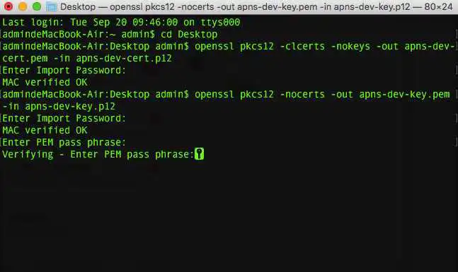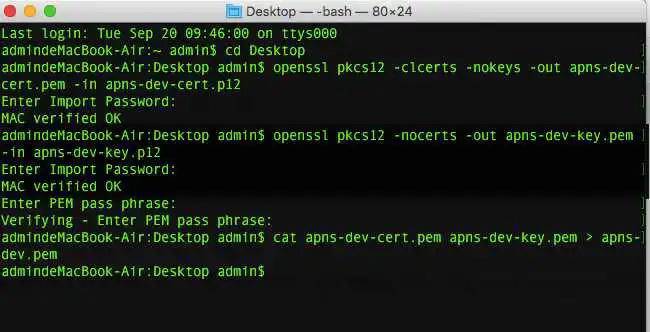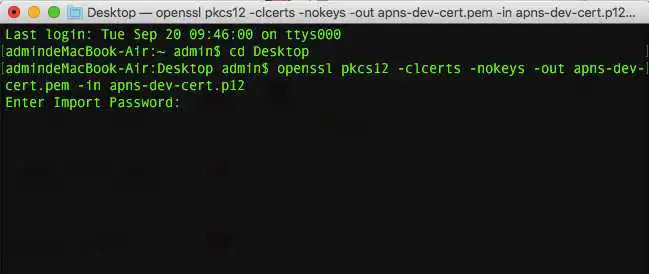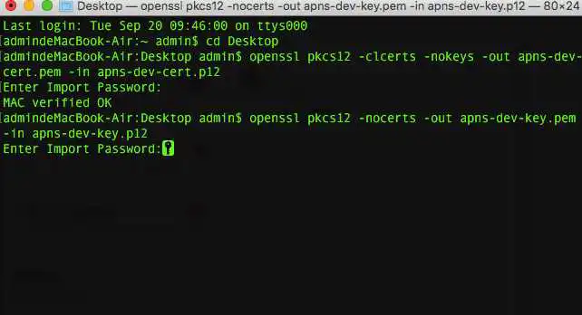 此处要求输入一个密码,输入.(此处为导出p12的保护密码),此时桌面会生成一个apns-dev-cert.pem文件