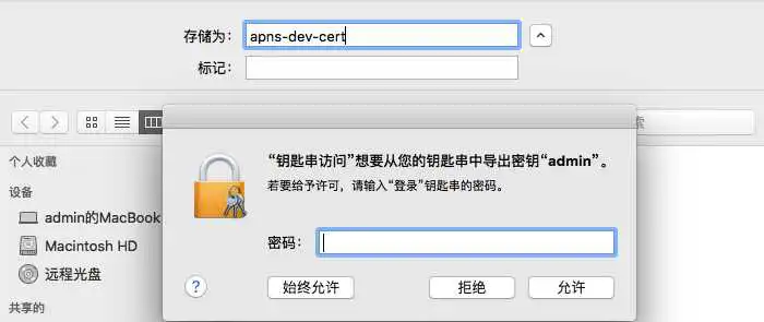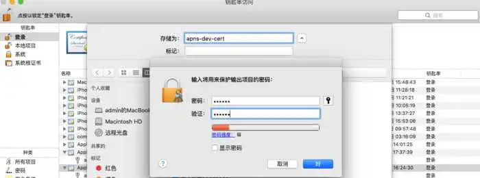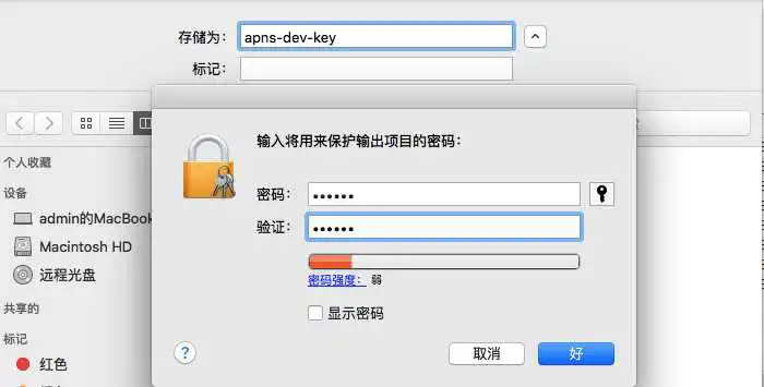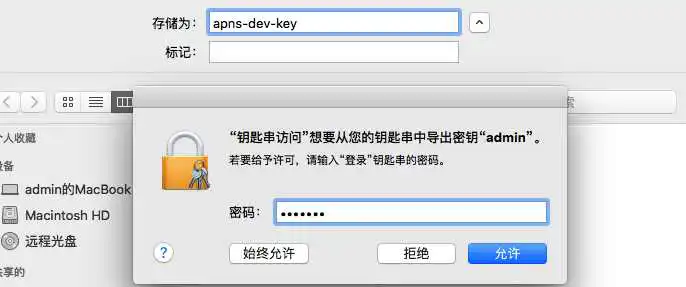 此处要求验证保护密码,再一次输入,此时桌面会生成一个apns-dev-key.pem文件