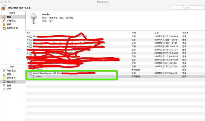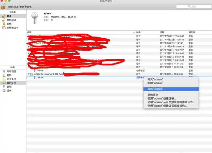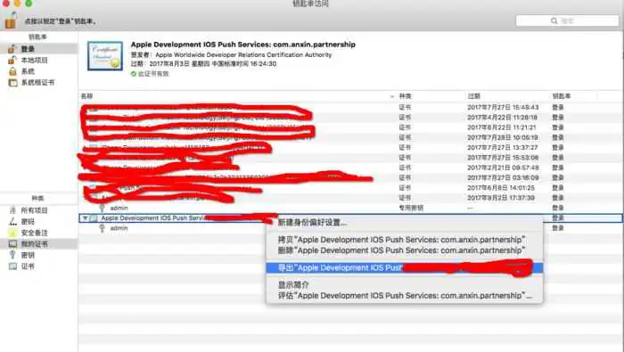 2.1、生成证书apns-dev-cert.p12的p12文件,按照下面操作导出p12,桌面对应生成apns-dev-cer.p12文件
