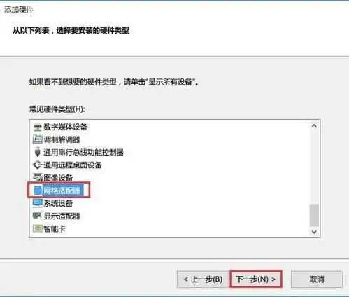 在弹出的向导窗口中,选择“手动安装硬件”选项,并在下一步中选择“网络适配器”。