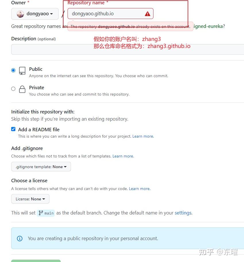 点击New,我们新建一个仓库,输入仓库名即可点击 Create repository(忽略我的提示,因为我已经有同名库了)