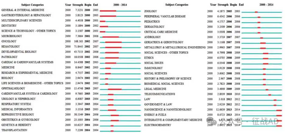 图3. 2000-2014 年间出现爆发的学科类别