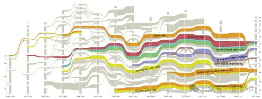传统的以干细胞研究为代表的基础研究和以组织工程为代表的应用导向研究在再生医学的科学计量景观中越来越趋于融合。