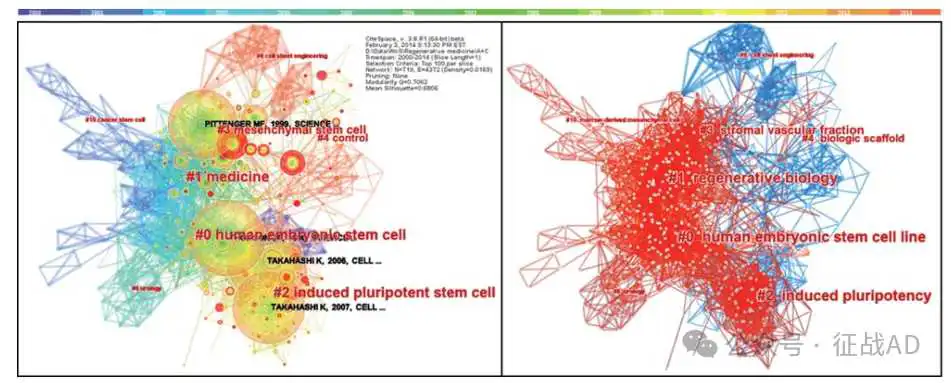 通过构建共引参考文献网络,本研究发现了再生医学领域中的多个研究热点,包括诱导多能干细胞(iPSCs)、组织工程、临床应用和基于石墨烯的纳米材料等。