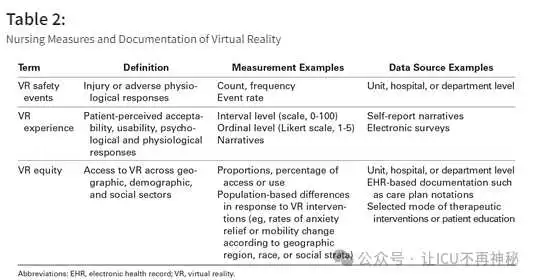 VR在医疗保健中的应用正在迅速扩展,超出了早期在模拟实验室和护理教育环境中的应用。越来越多的证据支持在重症监护环境中使用VR来缓解患者的压力、疼痛和焦虑;改善睡眠质量;此外,早期证据表明,VR可能有助于改善早期活动和康复的结果。有研究报道了对运动敏感的VR应用的技术开发过程,这使得患者在使用VR时能够进行渐进式运动。在Parke及其同事的临床应用场景中,患者报告说,参与VR体验可以改善运动范围和力量,激励他们继续治疗。