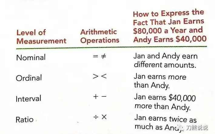 Ratio variable (定比型变量): 拥有最高级别的可定量化能力,可以做的分析种类最,多它的value不仅兼具以上三种变量的全部功能,而且它的“零点”是真的有意义的,是指真的为0。生活里好多这种变量,比如,“年龄”,“学生数量”,“工资”——0年就是0岁,0个学生就是没有学生,0元就是没有工资——这些都有实际意义。再看上面的interval variable——0华氏度,不代表没有温度,只是说温度是0这个刻度;而“零点钟”也不代表没有时间,只是代表当时时间的标度是0这个时刻。