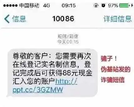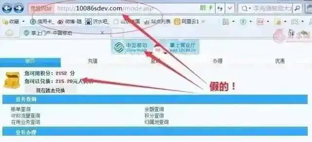 用“积分兑换现金”来诈骗的骗子,利用伪基站假冒10086不说,还模仿中国移动的官网做钓鱼网站!切不可轻易信任那些看上去与官方网站长得一模一样的钓鱼网站,不仅可能中病毒,还可能被骗走钱财。大家一定要养成核实网站域名、网址的习惯。例如中国移动的官网是以10086.cn为后缀的,其他乱七八糟的网址都是假的。