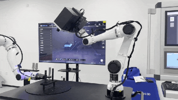 的重复定位精度,实现1+1>2。该工作站配备2台大族协作机器人,一台负责执行航发工件上下料工序、一台负责三维扫描仪的引导工作,协同完成自动化扫描,整个扫描与检测过程