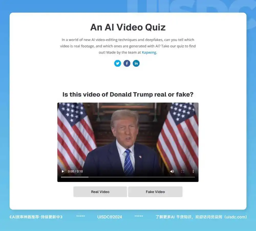An AI Video Quiz 是一个测试网站,里面有 10 个视频,你需要判断它们是真实的还是 AI 伪造的,完成后能看到自己的得分,大家不妨试试自己能选对多少个。
