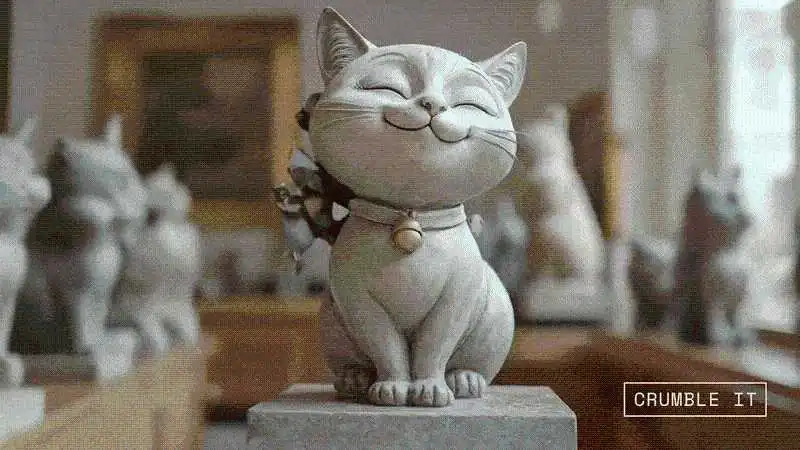 也许是看这项新功能很受欢迎,所以 Pika 很快又推出了 4 项新的特效模版,分别是破碎(Crumble)、溶解飘散(Dissolve)、放气(Deflate)和突然消失(Ta-Da),我试了一下效果依旧令人惊喜,并且目前还是可以免费使用的,推荐大家都去玩玩~