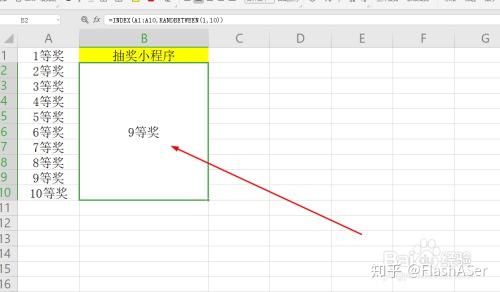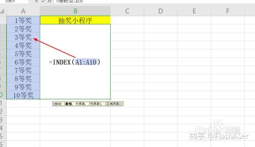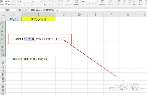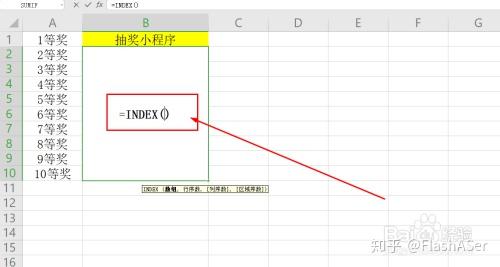 7.继续输入内容:=INDEX(A1:A10,RANDBETWEEN(1,10))