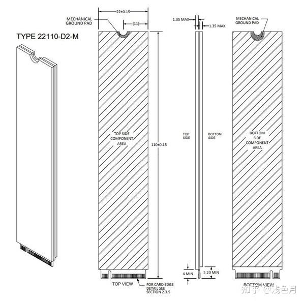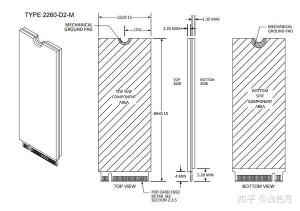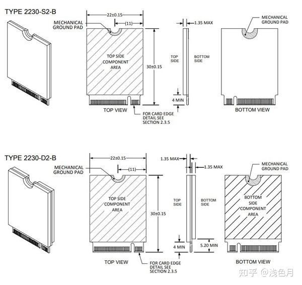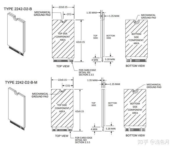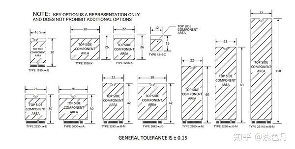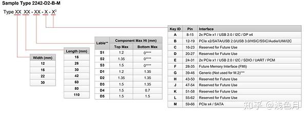 综合厚度、尺寸和防呆卡槽,就是M.2(NGFF)扩展卡的命名规则。例如Type 2242-D2-B-M,说明扩展卡宽22mm,长42mm,厚1.35mm,支持KeyB和KeyM。