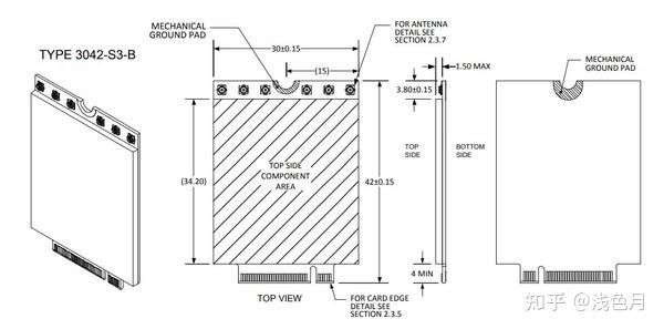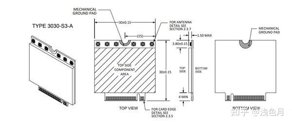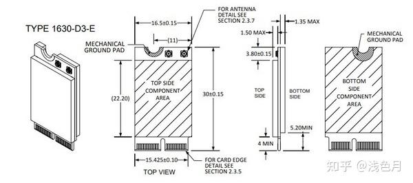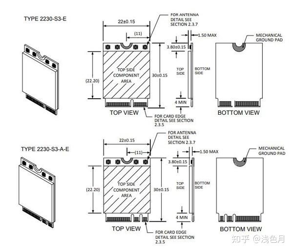 M.2(NGFF)扩展卡最多见于无线网卡,一般是Type 2230、Key E和Type 2230、Key A+E,标准尺寸参数如下图。