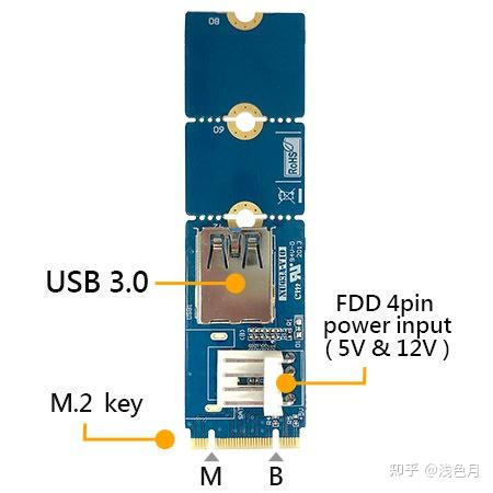 M.2 key M的PCIE总线,转接出两个19针的USB3.0接口,需要接4pin供电。