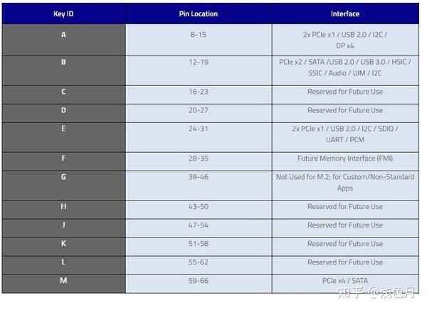 对比mini PCI-e接口,M.2接口要复杂得多。M.2接口根据防呆设计的不同,被划分成多种Key,不同的Key有不同用途,支持不同的通讯协议。