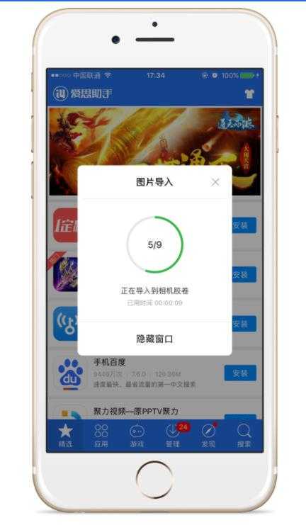 导入过程中保持数据线的连接,请不要拔掉数据线也不要强行关闭移动设备上的“爱思极速版”,等待导入完成。