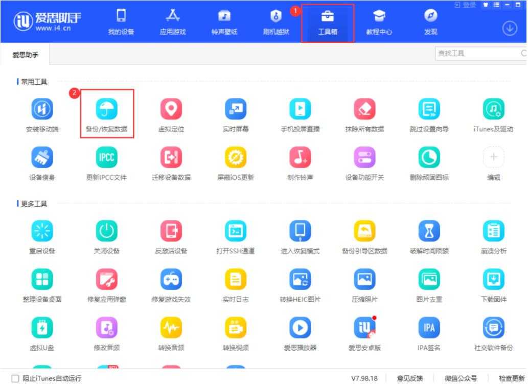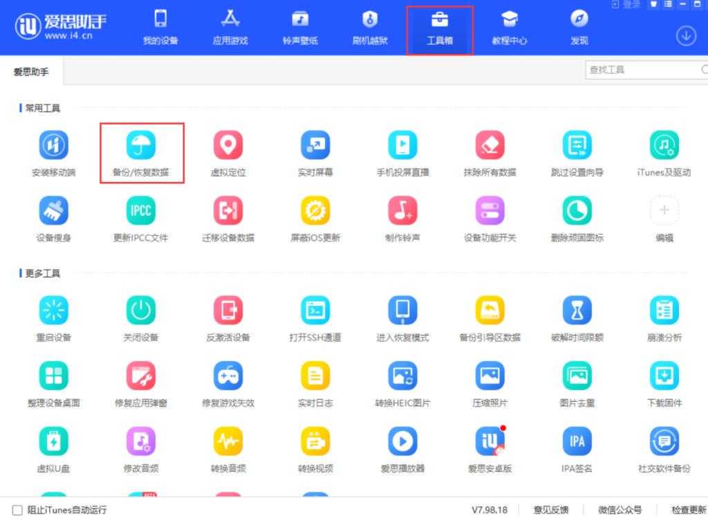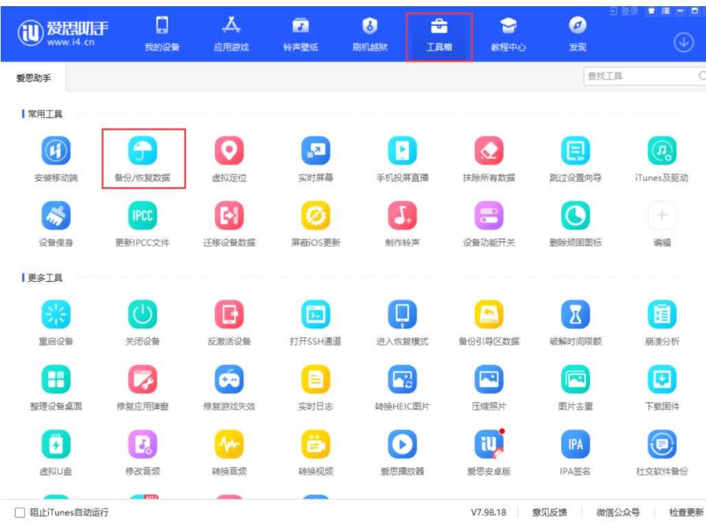 1、打开爱思助手 PC 端,打开工具箱中的“备份/恢复数据”: