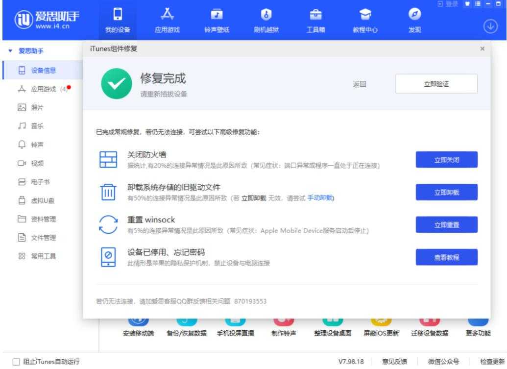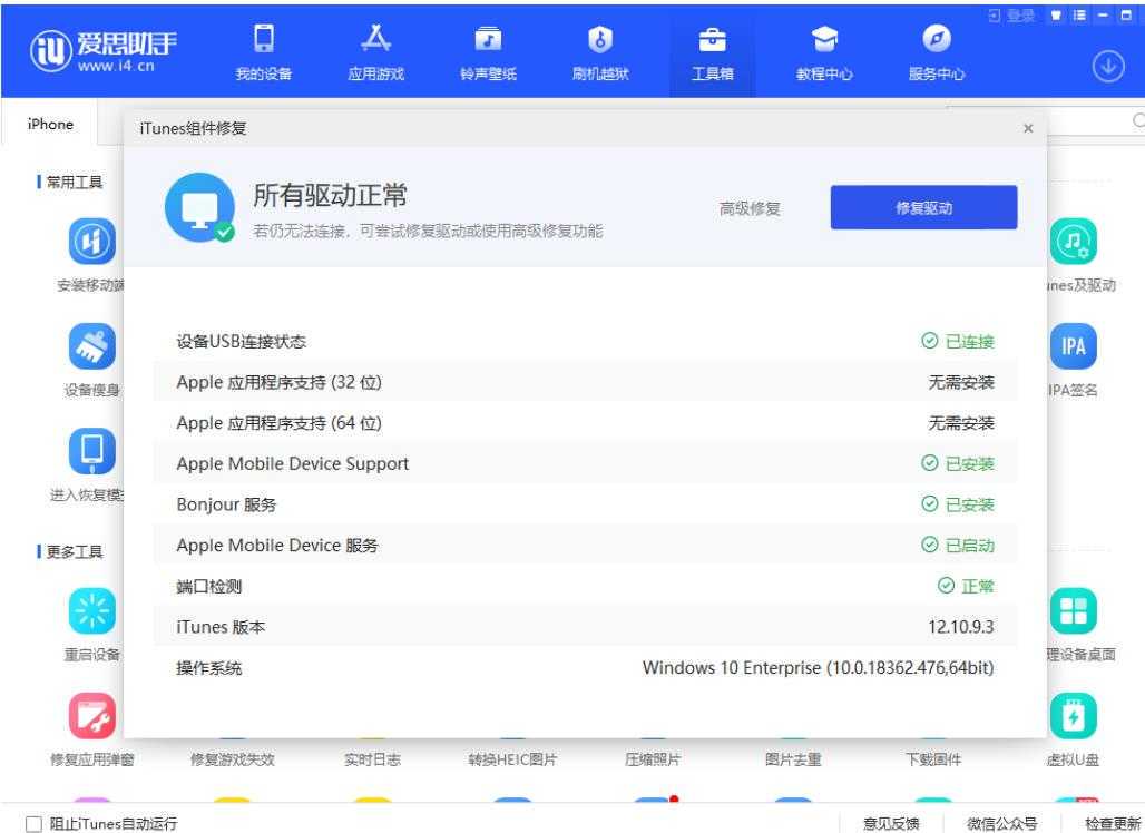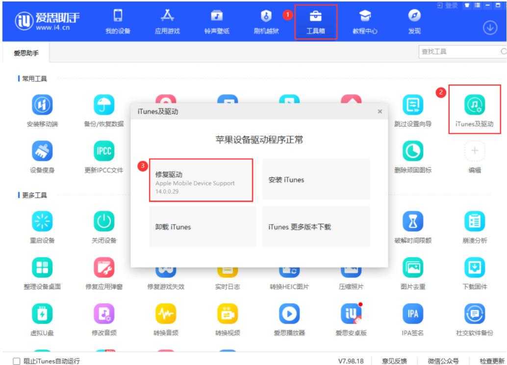 依次点击爱思助手上方的「工具箱--iTunes及驱动--修复驱动」,修复成功后重新连接设备。