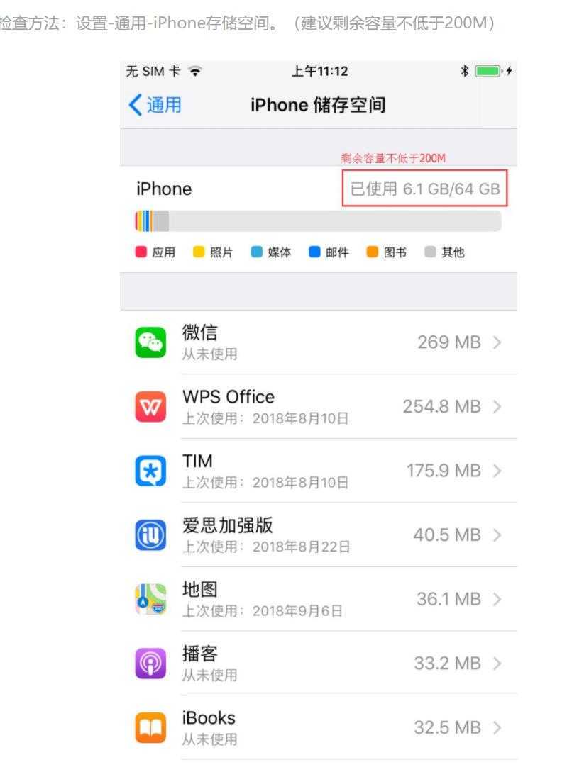 检查方法:设置-通用-iPhone存储空间。(建议剩余容量不低于200M)