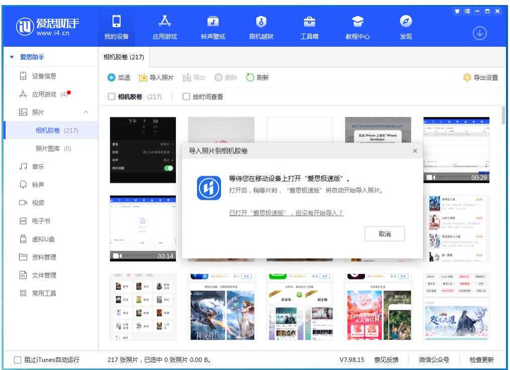 1、使用爱思助手PC端导入照片到相机胶卷时,我们只需在移动端打开爱思极速版即可导入照片到相机胶卷。