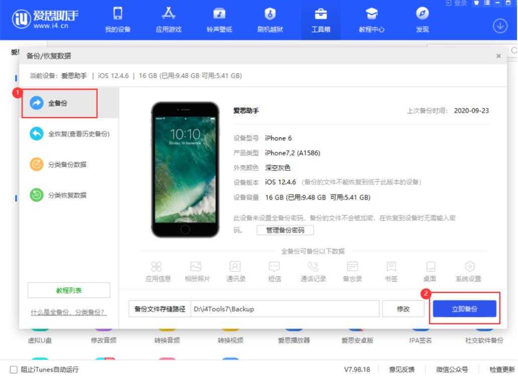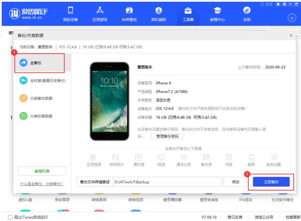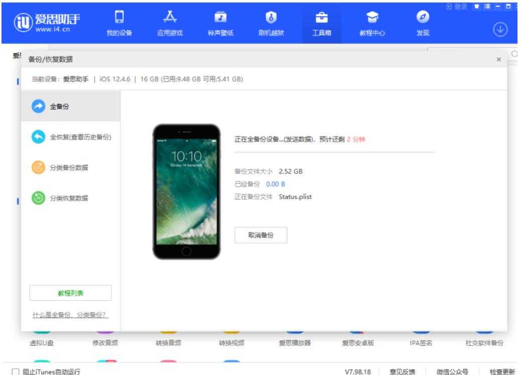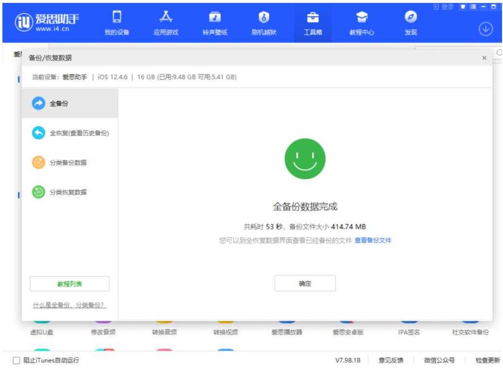 2、在转移文件的过程中,使用此备份文件的同一台设备,再使用爱思助手重新全备份一次(需要用新备份中的两个文件);
