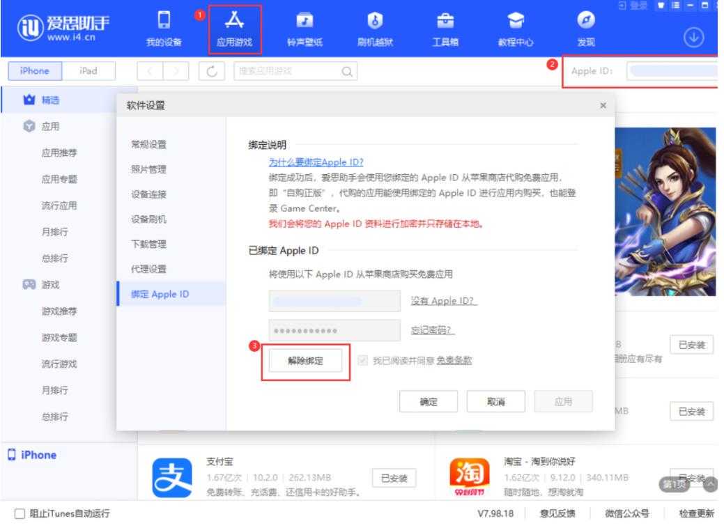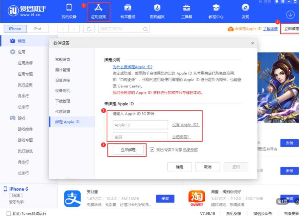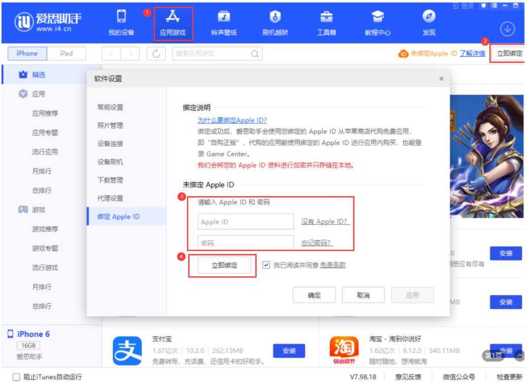 1、首先在爱思助手PC端“应用游戏”界面点击“立即绑定”进行绑定AppleID(了解什么是绑定AppleID);