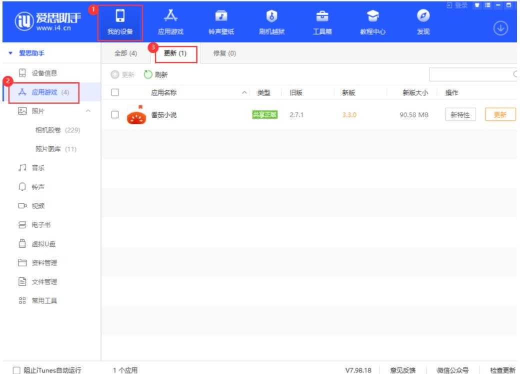 卸载应用会导致当前应用内数据全部丢失,如果需保留应用内数据,可使用爱思助手进行更新:在爱思助手 PC 端“我的设备”中点击“应用游戏”-“更新”。或参考方法二。