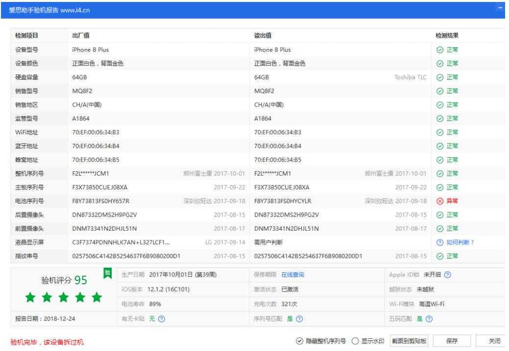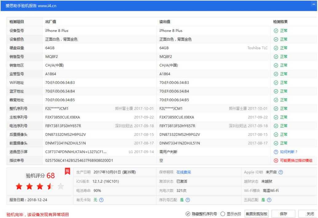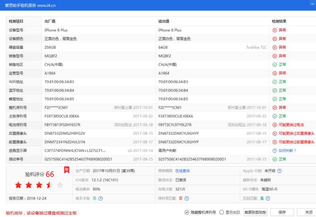 若您设备检测结果中电池序列号、前置摄像头、 后置摄像头、指纹串号四项均不正常(无指纹的设备只要前三项不正常)或验机异常3项及以上,则该设备换过硬盘或换过主板。