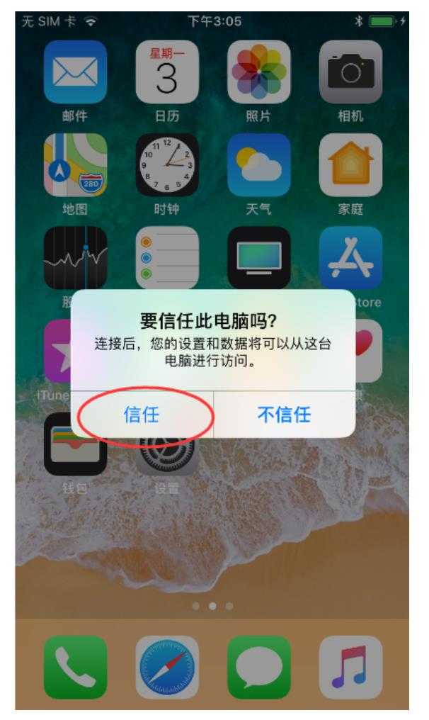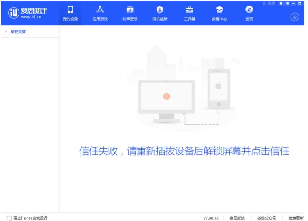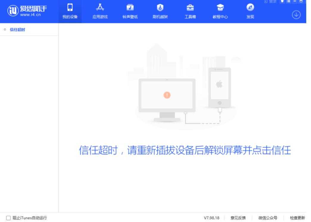 连接设备,长时间未在设备上点击“信任”或手动点了“不信任”,提示“信任超时”和“信任失败”;