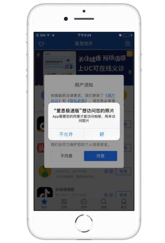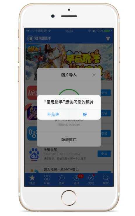 2、首次打开“爱思极速版”时,移动设备会弹出“爱思极速版想访问您的照片”的提示,请点“好”以允许“爱思速度版”将照片存储到您的相册中。