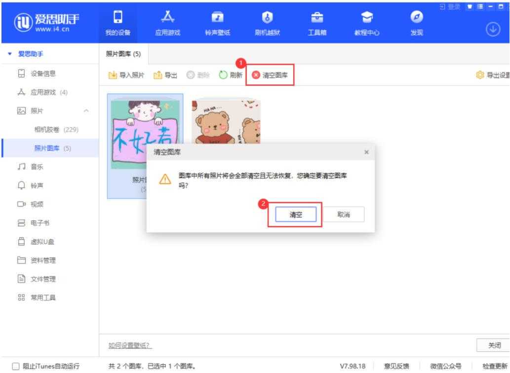 2、点击上方“清空图库”按钮,再点击“清空”;