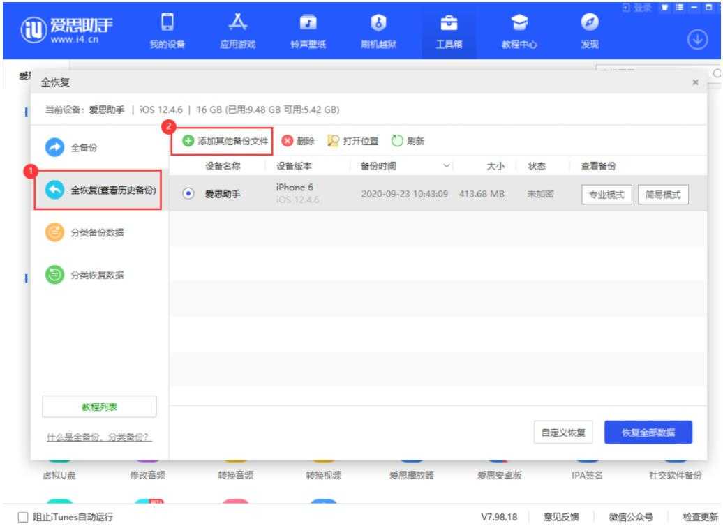 4、通过前面的步骤我们已经将旧备份文件补全了,此时到爱思助手全恢复界面添加这个备份,添加成功后就可以恢复了。