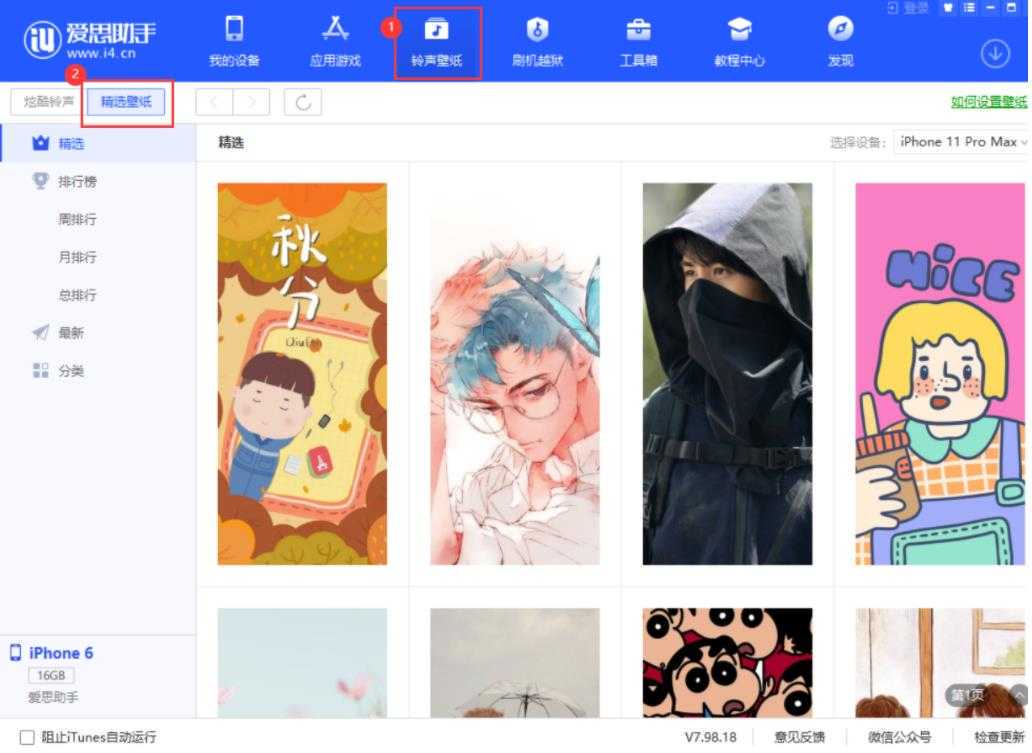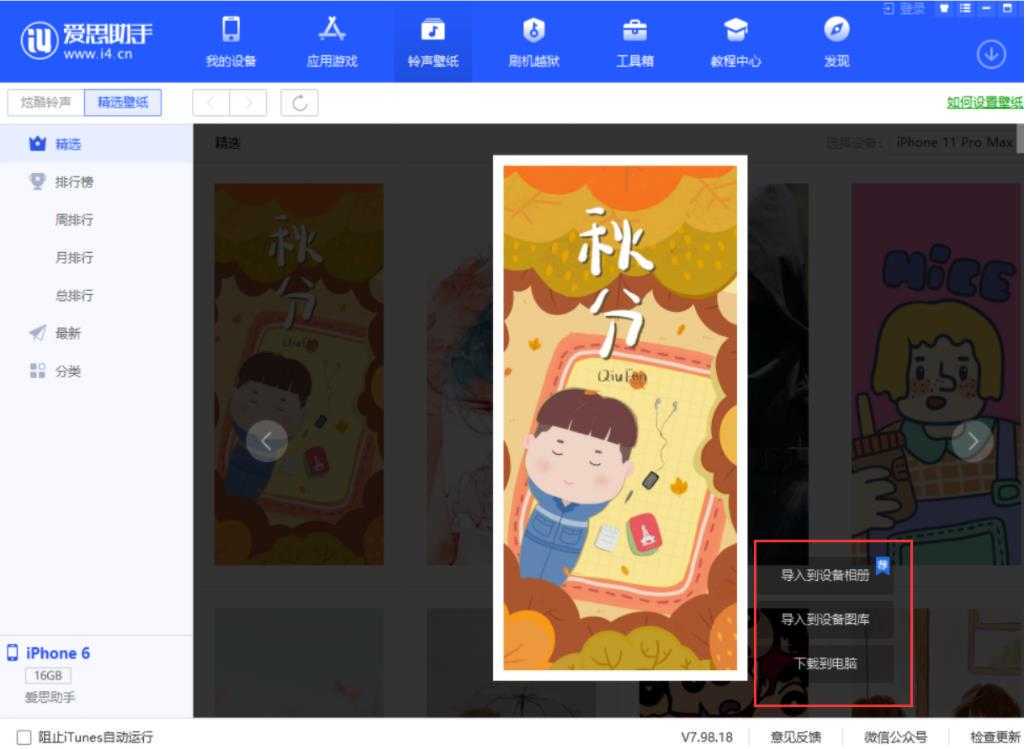 如果使用爱思助手PC端到高清壁纸里选择壁纸“导入到设备相册”可参考下面解决方法二。