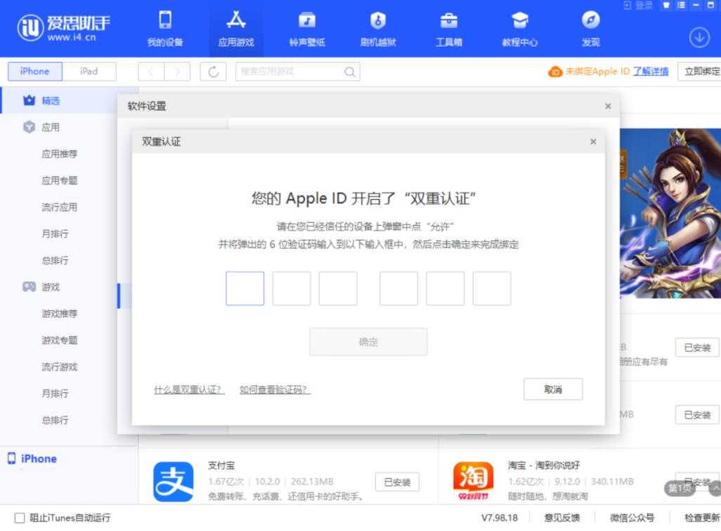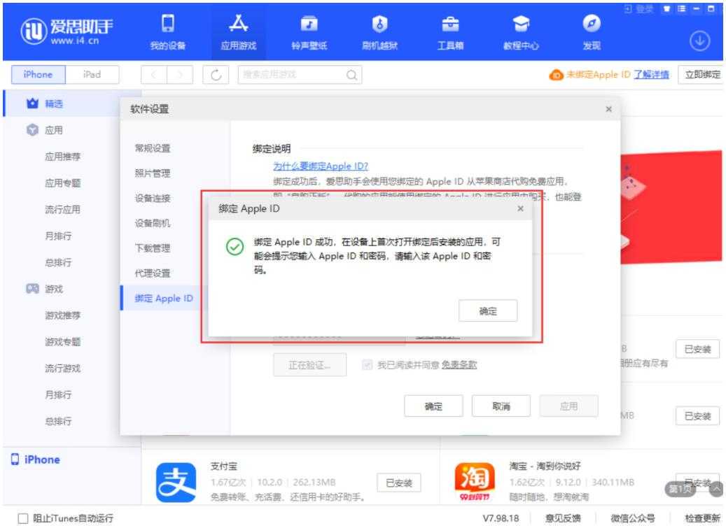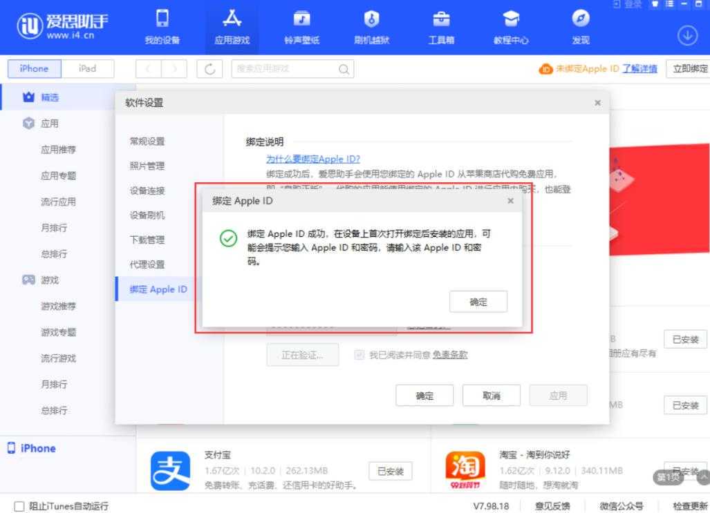 绑定成功后,爱思助手会使用您绑定的 Apple ID 从苹果商店代购免费应用,即“自购正版”,代购的应用能使用绑定的 Apple ID 进行应用内购买,也能登录 Game Center。